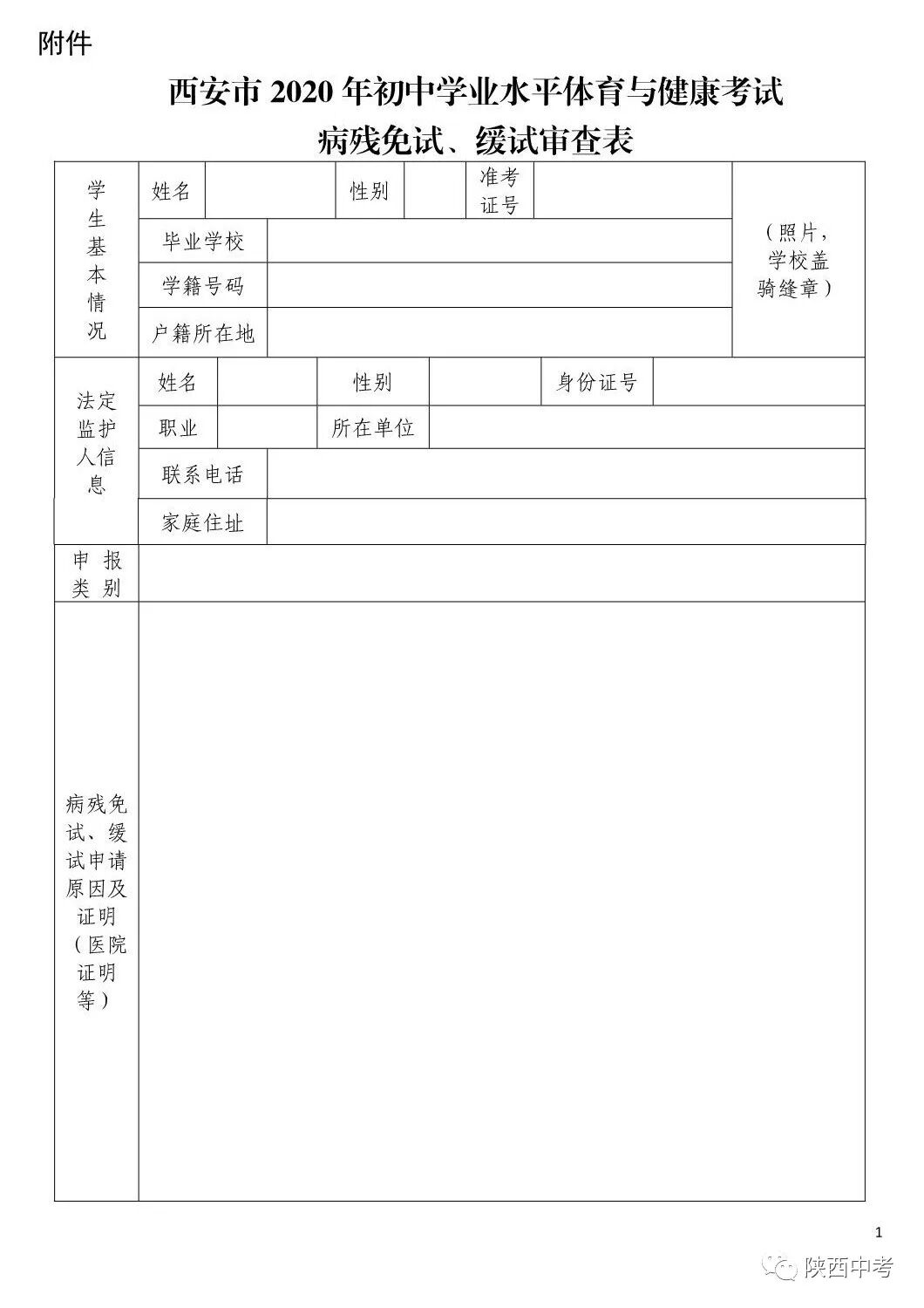 表格下載西安市2020年初中學(xué)業(yè)水平體育與健康考試病殘免試、緩試審查表word版下載: